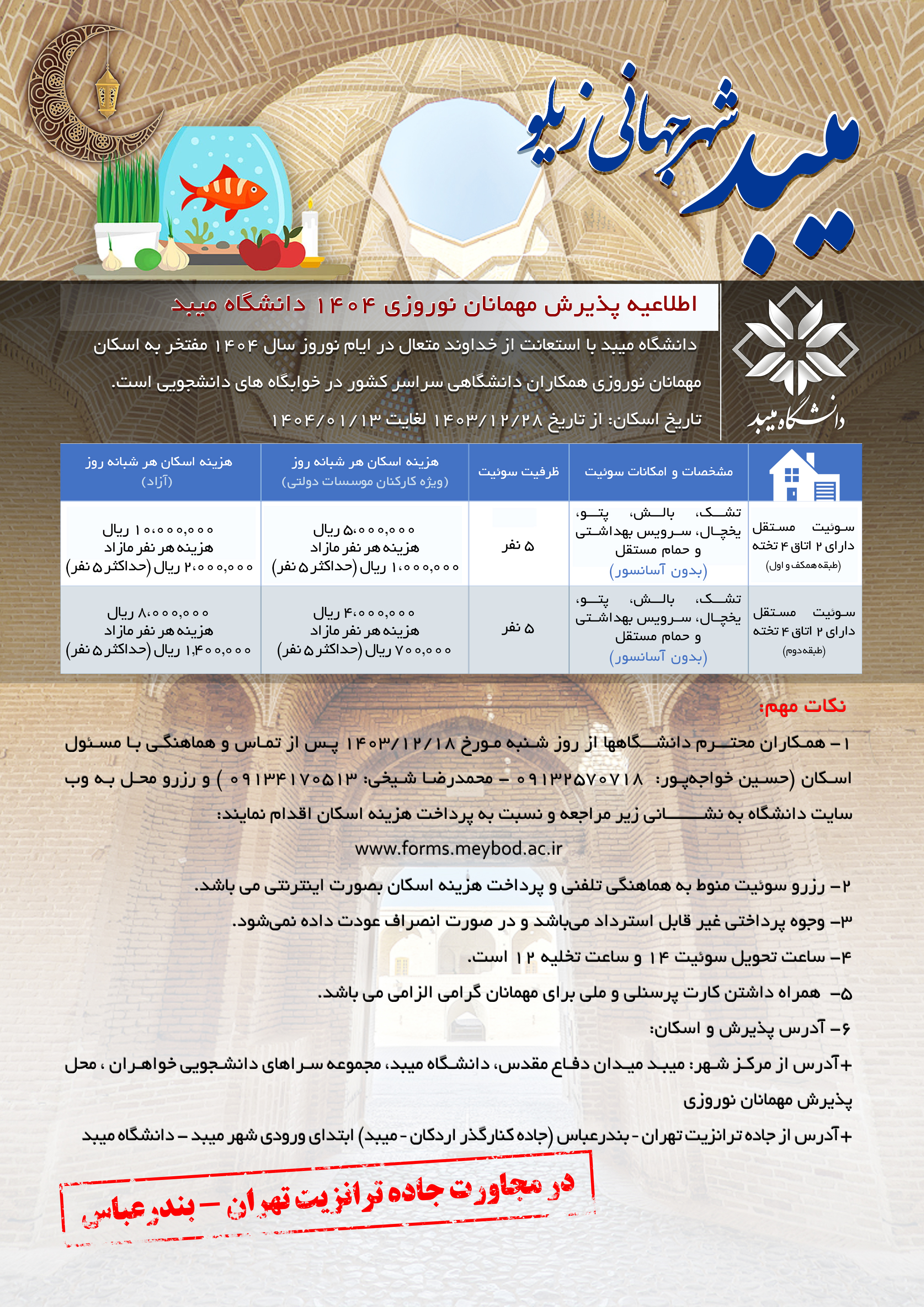 به اطلاع همکاران گرامی می رساند با عنایت به نزدیک شدن به نوروز 1404، اطلاعیه های نحوه خدمات دهی و پذیرش مهمانسراهای دانشگاه های کشور جهت هماهنگی و رزرو با مقصد مورد نظر در لینک های ذیل قابل دسترسی می باشد. ضمنا به مرور این خبر به روزرسانی خواهد شد.